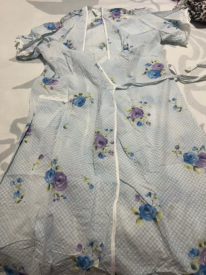 Uzun kesim, V yaka ve kısa kollu, bol kesim sabahlığı. mavi zemin üzerinde çiçek desenlidir.