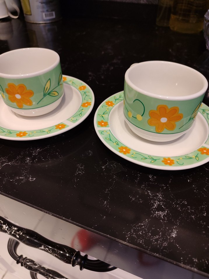 Yeşil renkte, sarı ve turuncu çiçek desenleriyle süslenmiş kahve fincanı ve tabağı . Büyüklüğü türk kahvesi ile nescafe fincanı arasında