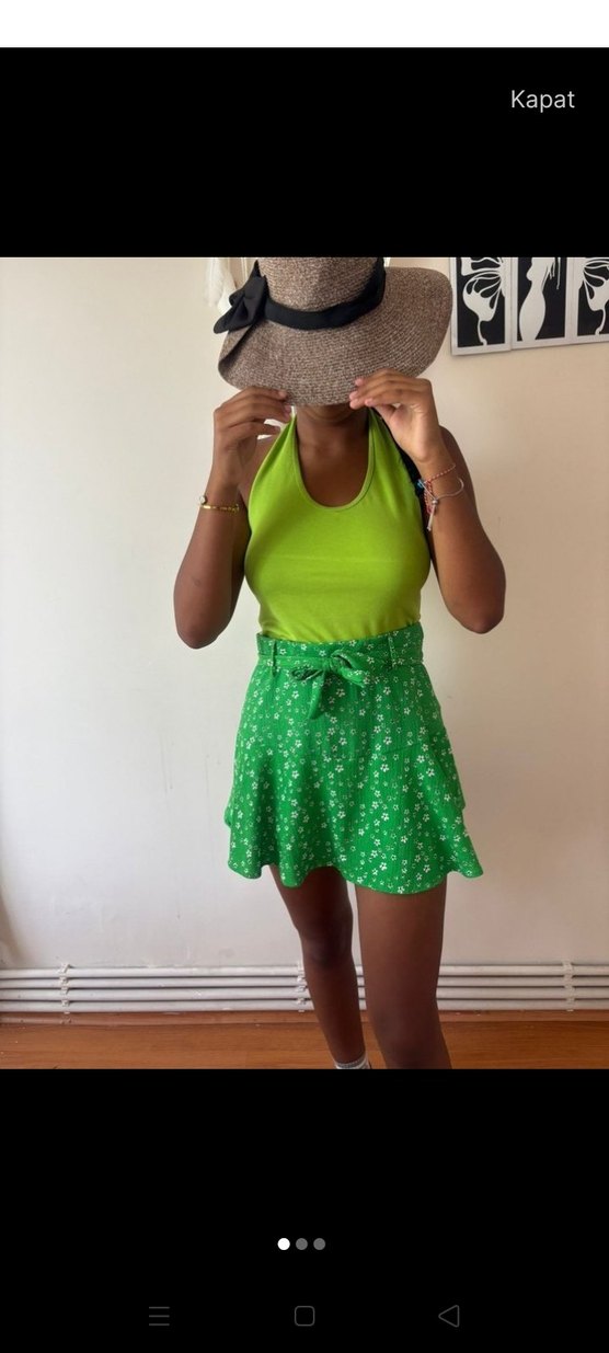 Düz yeşil tonlarında, çiçek desenli ve belden bağlamalı, hafif sentetik kumaştan mini etek. Rahat ve şık bir günlük kullanım parçası.