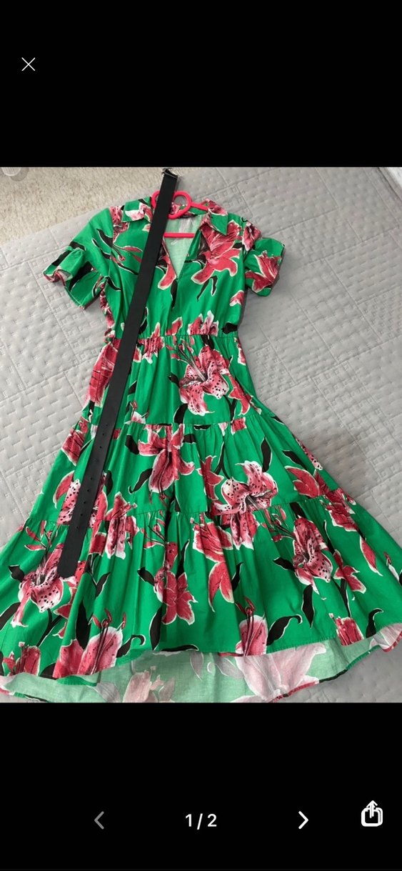 Yeşil uzun elbise, renkli çiçek desenli ve V yakalıdır. Askılı kollu, bol kesim ve fırfır detaylıdır, bohem tarzına uygundur.