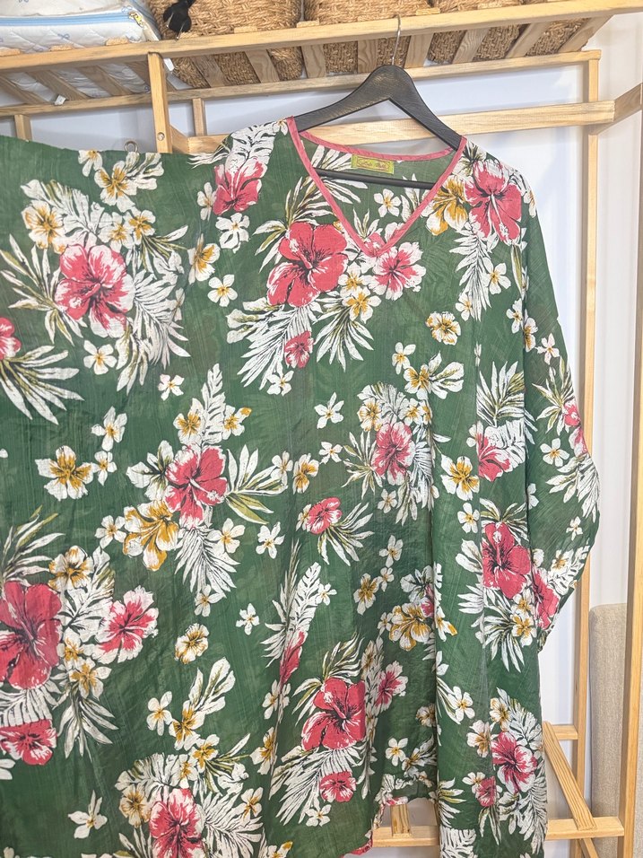 Renkli çiçek desenli, uzun boy, dökümlü uzun kollu, yuvarlak yakalı yeşil kimono. Yumuşak sentetik kumaştan, bol kesim bohem tarzda.