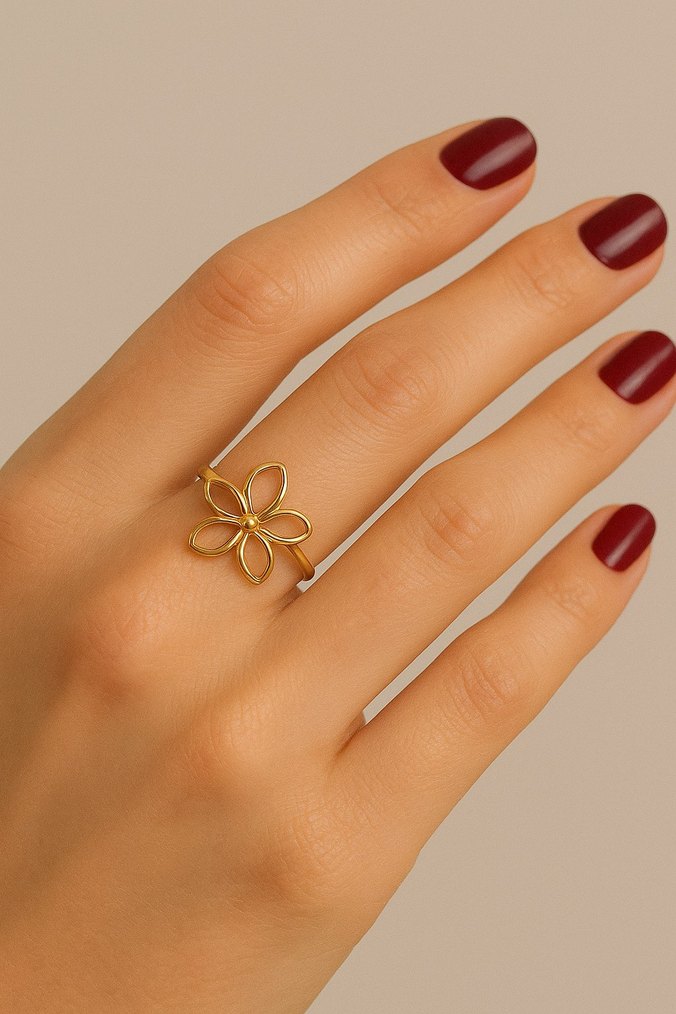 Parlak altın renginde, çiçek desenli minimalist yüzük, romantik akşamlar için bohem tarzda sade bir şıklık sunar.