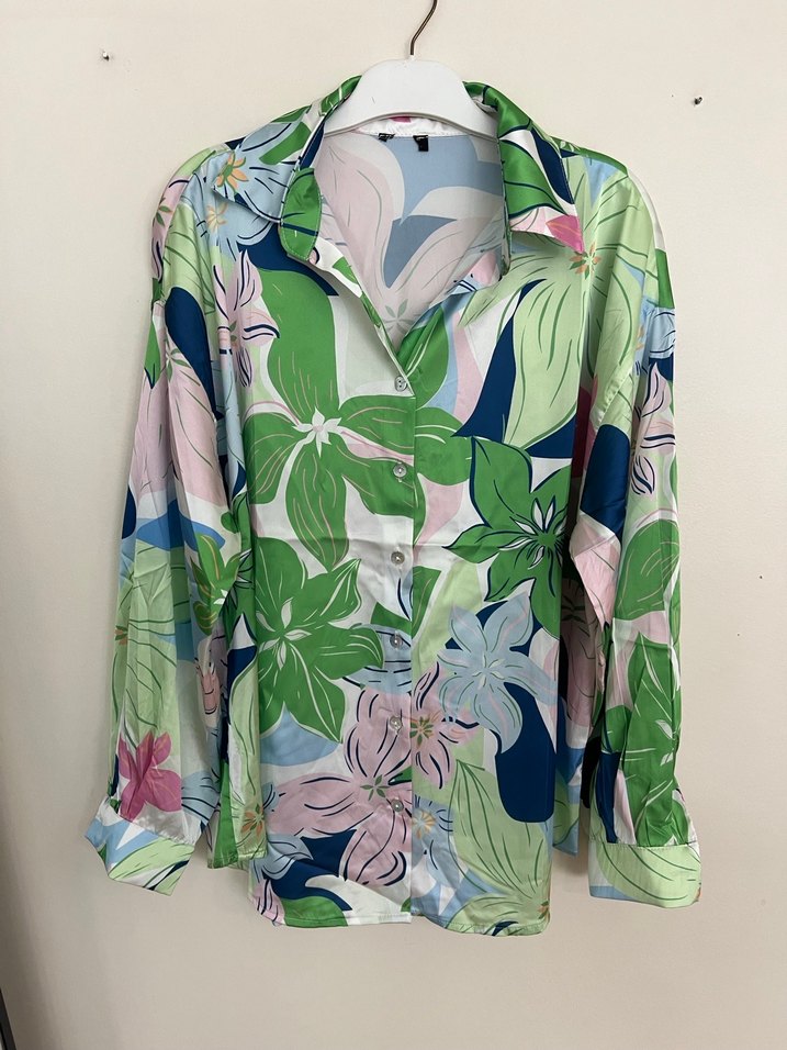 Zara etiketi kesik uzun kollu bol kesim yumuşak saten gömlek Canlı pastel çiçek desenleri çok güzel. #gömlek #oversizegömlek #satengömlek