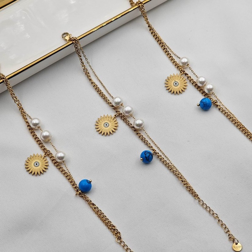 Altın renkli zincir bileklikler, çiçek şeklinde güneş figürü, mavi boncuk ve inci detaylarıyla bohem ve minimalist tarzı yansıtıyor. celik kararmaz solmaz bayan bileklik
