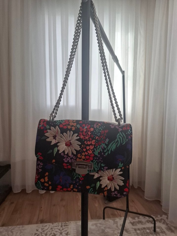 Bohem tarzda, koyu renk çok renkli çiçek desenli, zincir detaylı kadın çantası. Sentetik kumaştan üretilmiş, günlük kullanıma uygun.