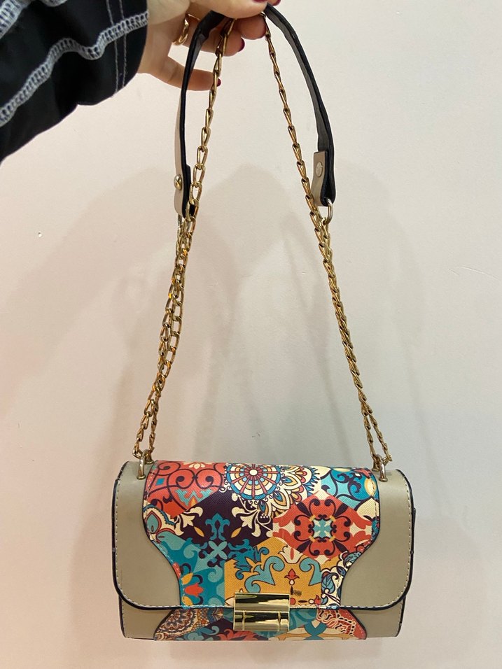 Çiçek desenli, zincir detaylı renkli deri çanta, bohem tarzı yansıtır ve günlük kullanım için uygundur. Fotoğraflarda göründüğü gibi kenarlarında biraz deformeler var fakat çok göze batmıyor