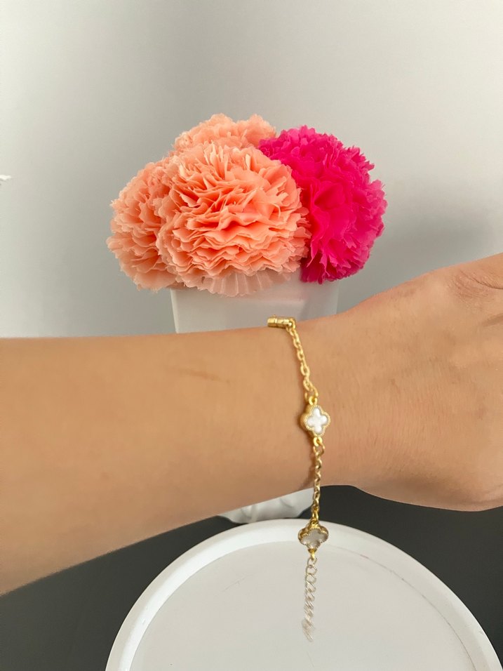 Kadın bileklik, zarif zincir ve beyaz çiçek detaylarıyla minimalist ve klasik şıklığı modern tarzla buluşturuyor. Düğünler için uygun.