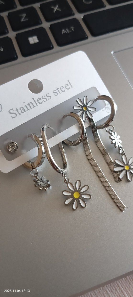 Kısa uzunlukta, paslanmaz çelikten çiçek desenli ve zincir detaylı kadın küpeler, bohem ve minimal tarz için uygun.