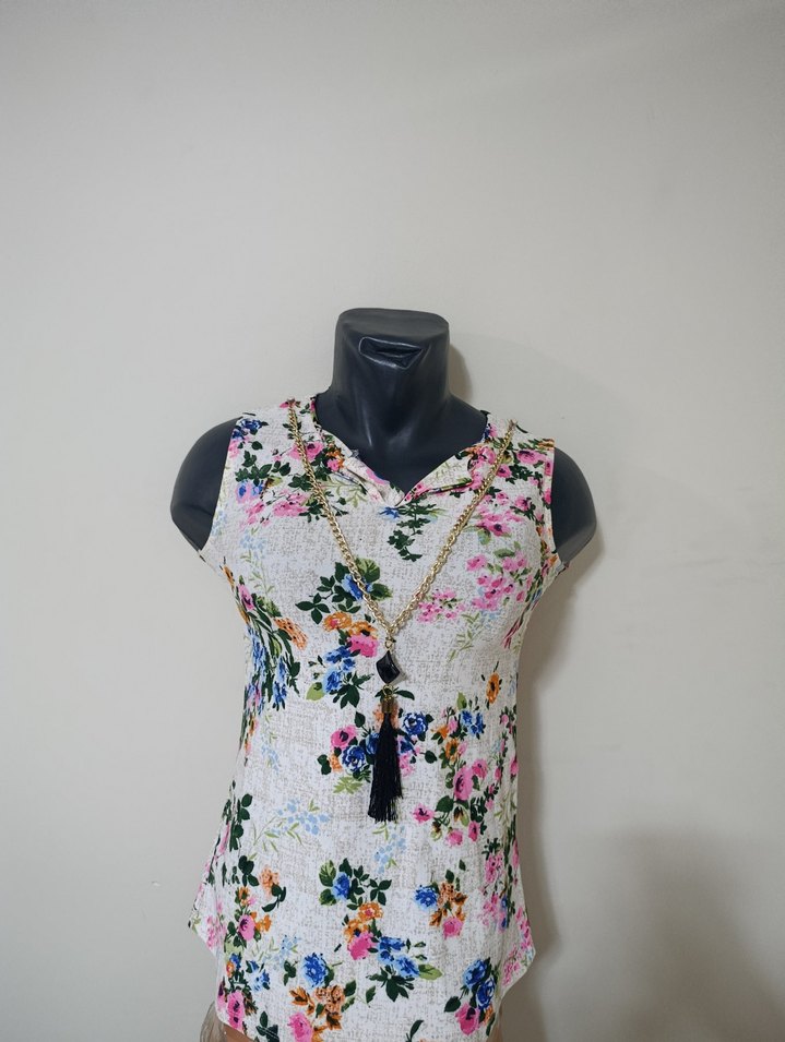 Çiçek Desenli Zincir Detaylı Kolsuz Bluz