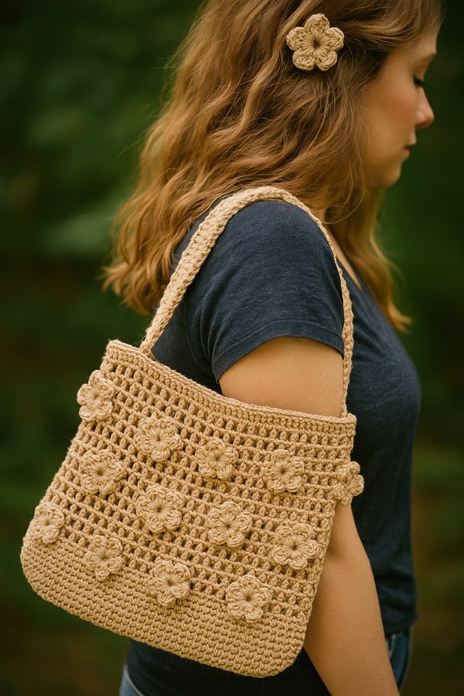 Bej renkli, çiçek detaylı örgü bohem kadın çantası, günlük kullanıma uygundur.