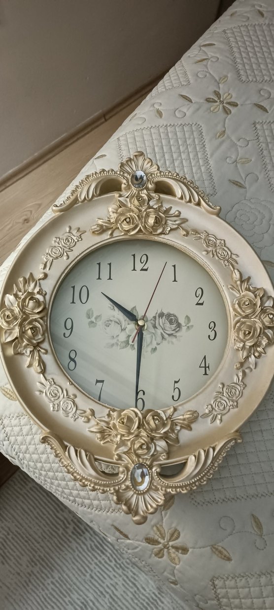 Çiçek süslemeli, beyaz klasik tasarımlı duvar saati. Hafif ve zarif çerçevesi, süs gül ve kristal detaylar içerir. ️