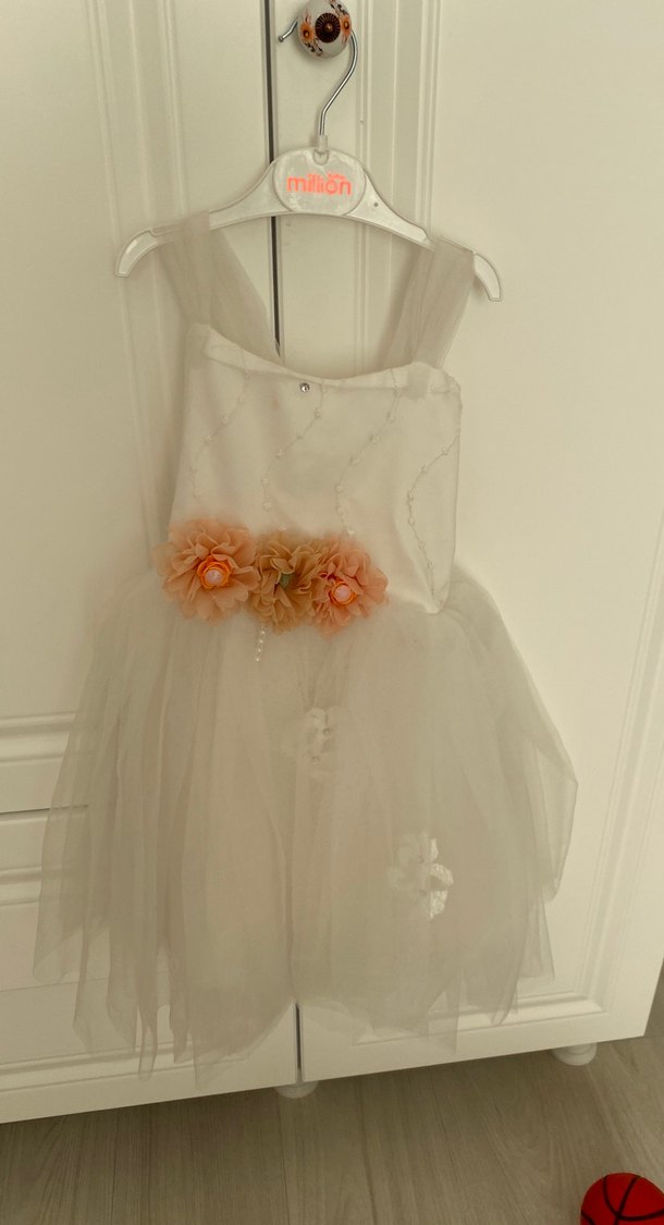 Kolsuz, straplez üst kısmı oturan, çiçekli fırfır detaylı ve akışkan bohem tarzda beyaz kız çocuk elbisesi. Yumuşak sentetik kumaştan yapılmıştır.