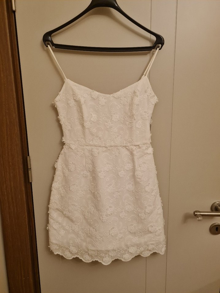 Askılı, straplez beyaz mini elbise, dantel çiçek detaylı ve vücuda oturan kesimiyle minimalist bohem tarz sunar. Romantik akşamlar için uygundur. Hiç giyilmedi, etiket mevcut.