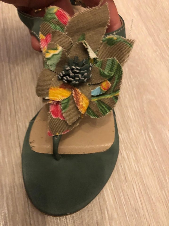 Koyu yeşil renkte, dolgu topuklu, çiçek detaylı kumaş süslemeli ve tokalı kayışlı bohem tarzı kadın sandalet.