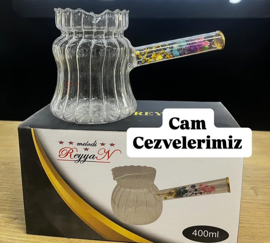 400ml cam cezve, sapı renkli kurutulmuş çiçeklerle süslenmiş. Fonksiyonel ve dekoratif kullanım için uygundur. ☕