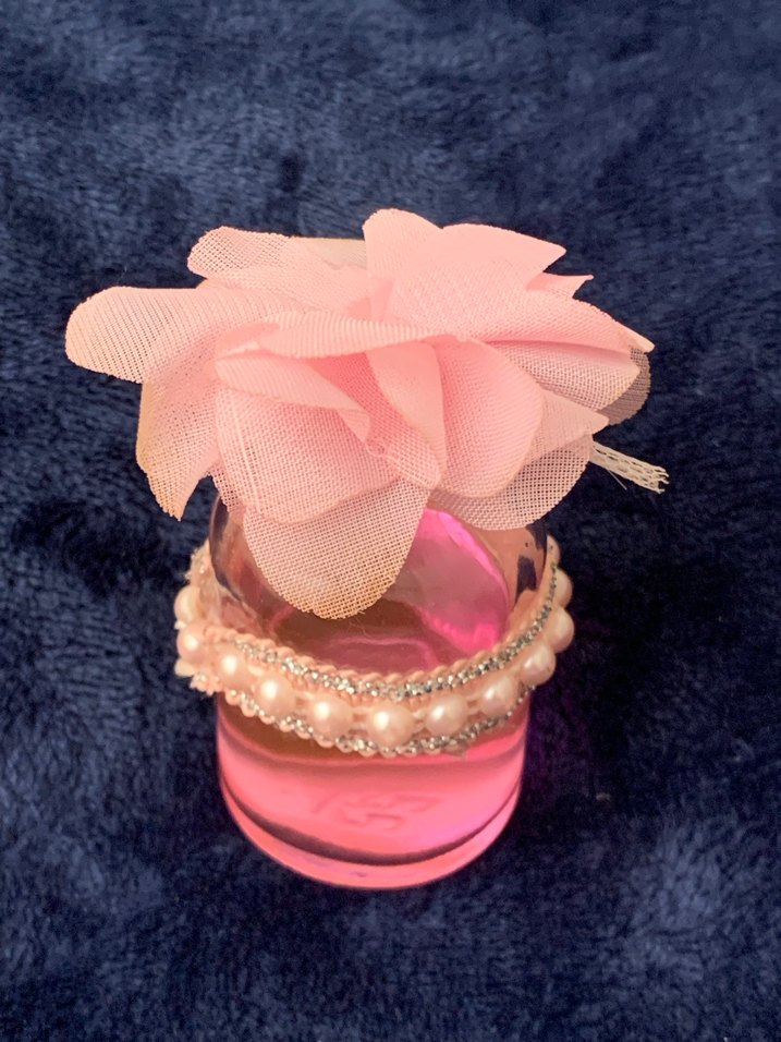 Üstü pembe kumaş çiçek kapaklı, inci ve kristal detaylı kadın parfüm şişesi. İçindeki sıvı pembe renkte.