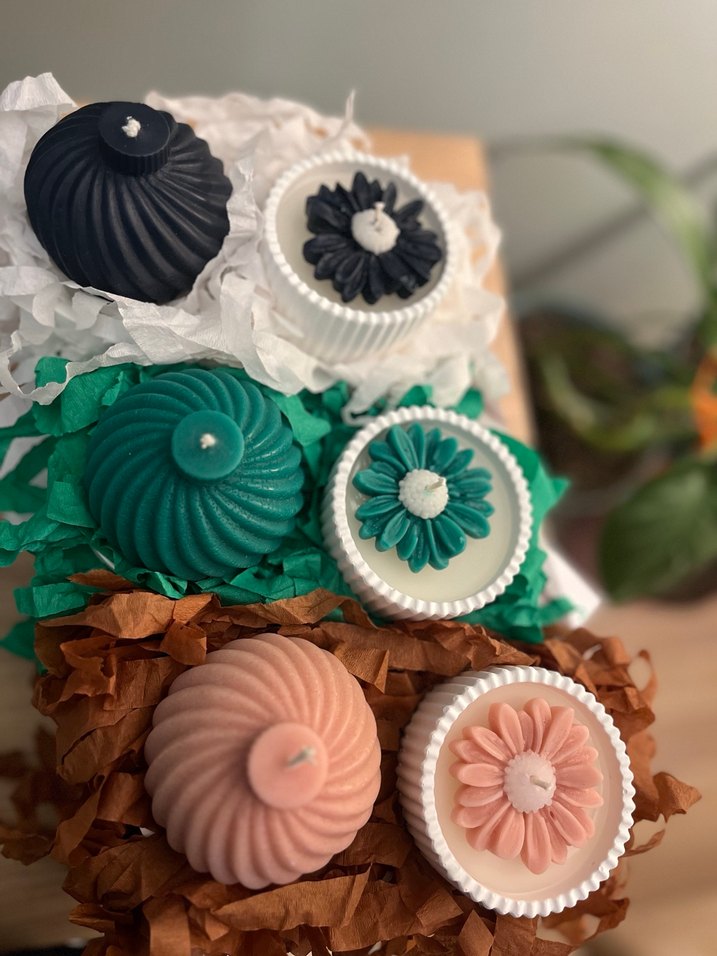 Çiçek detaylı, koyu renklerde ve canlı tonlarda çok renkli mumlar