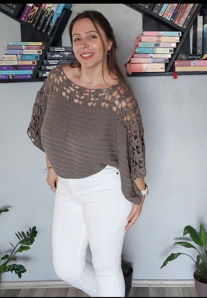 el emeği omuz ve kolları çiçek detaylı örgü salaş crop