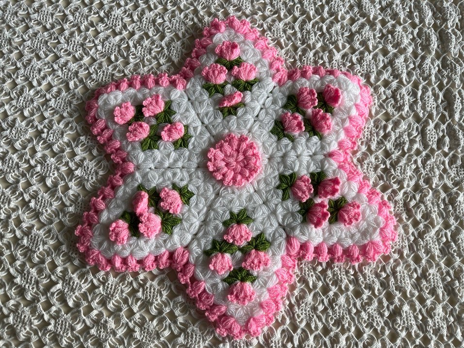 Renkli nakışlı çiçek desenleriyle süslenmiş pembe el örme lif, yumuşak ve rahat dokusuyla dikkat çekiyor.