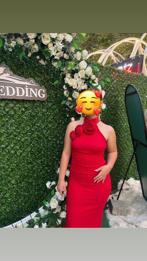 Bu kırmızı uzun abiye elbise, yüksek yakası, çiçek detayları ve ince askılarıyla dikkat çekiyor. Cesur ve şık bir tasarım.