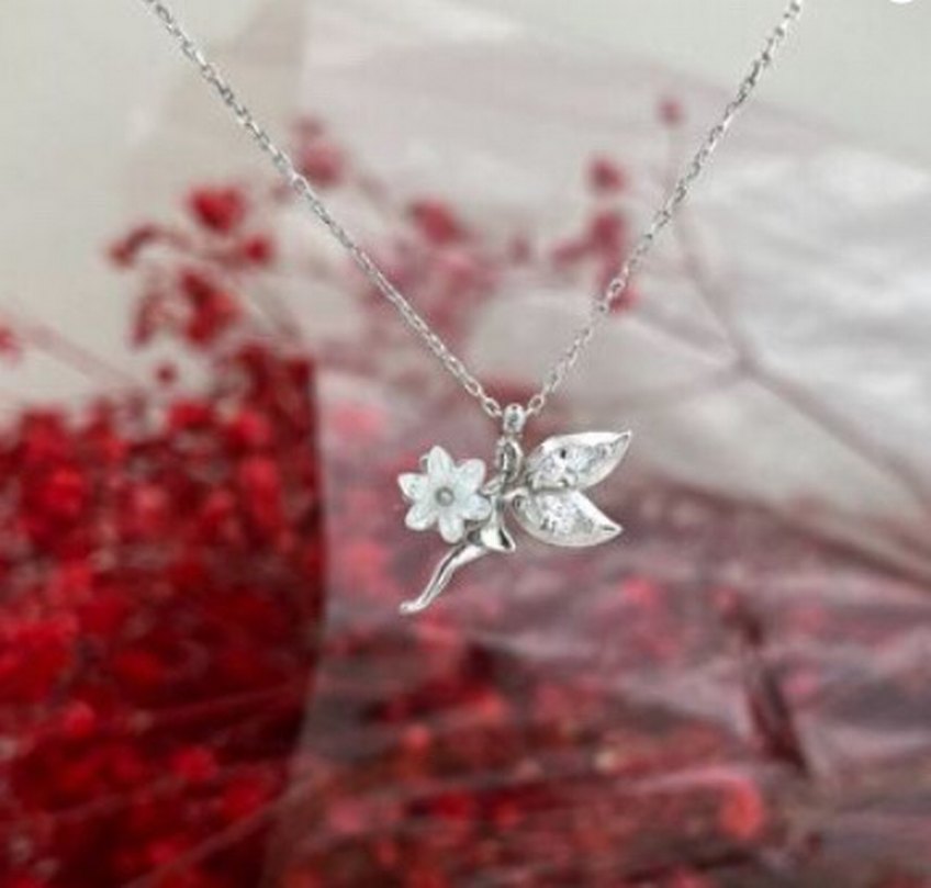 Kısa uzunlukta, zincir detaylı ve çiçek desenli kadın kolyesi. Bohem tarzında, klasik zarafeti yansıtır, düğün için uygun. 925 ayar gümüş