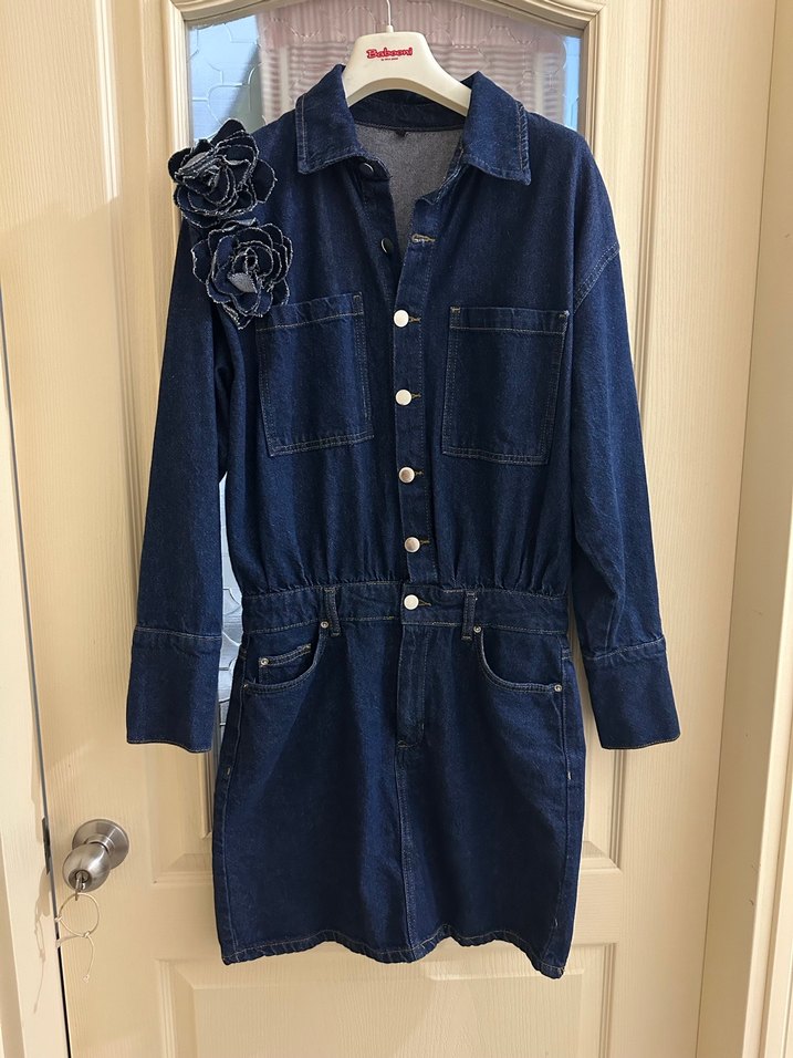 Lacivert denim midi elbise, düğmeli ve omuzda çiçek detaylı. Polo yaka, uzun kollu, bol kesimle rahat bir günlük tarz sunar. Sorunsuz üründür