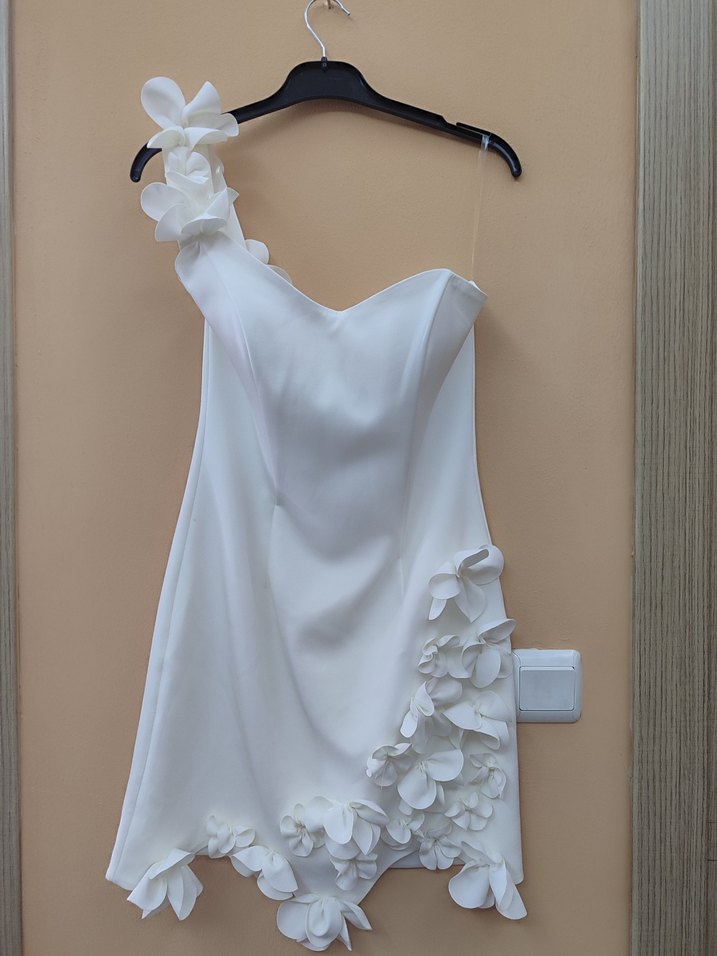 Bu beyaz mini gelinlik, straplez ve kolsuz tasarımıyla dikkat çeker. Etek ucu ve omuzda 3D çiçek detayları bulunur, çağdaş ve avant-garde bir stil sunar. Ürün hic giyilmedi. After parti için alındı fakat başka alternatiflerden dolayı kullanılmadı. Esnek kumas olduğu için s beden olmasına ragmen kalça ölçüsü 104 cm de rahat olur.