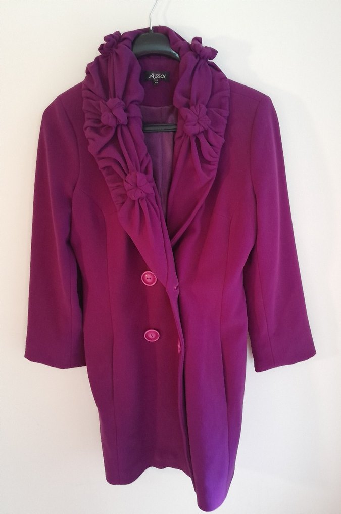 Mor renkte, yakasında çiçek detaylı fırfır süslemeleri bulunan, iki düğmeli kaban. Şık ve feminen bir görünüm sağlar.