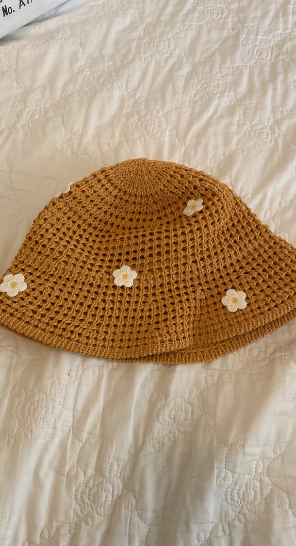 Nefes alabilen, açık örgü yapısına sahip kahverengi şapka, küçük beyaz çiçek detaylarıyla bohem tarzı tamamlar. Marka temsili yurtdışından alındı