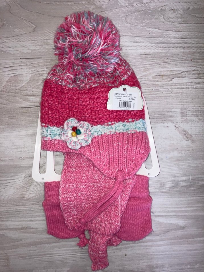 Çiçek Detaylı Pembe Örgü Çocuk Bere ve Atkı Seti