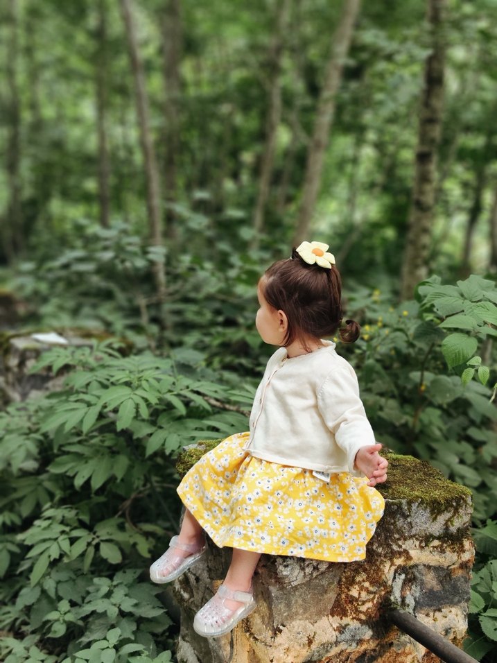 Sarı renkli, dantel detaylı kız çocuk elbisesi, uzun kollu hırkası . Gevşek kesimi ve pastel tonlarda tie-dye deseniyle bohem tarzını yansıtır.