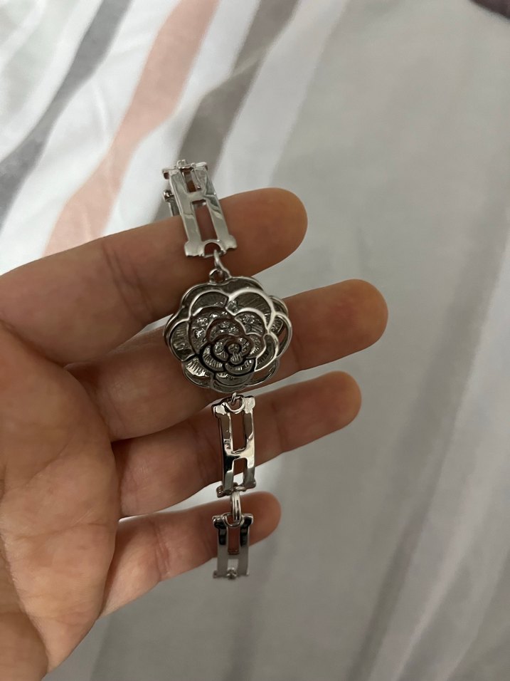 Gri ve bej tonlarında çiçek detaylı zincir tasarımına sahip kadın bileklik, vintage stilini yansıtır. Günlük kullanım için uygundur.