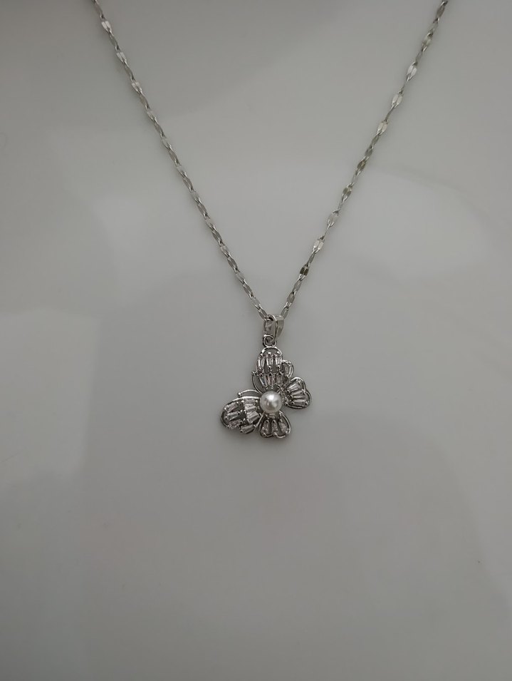 Günlük kullanım için uygun, beyaz ve gri tonlarda çiçek detaylı minimalist bohem midi zincir kolye.