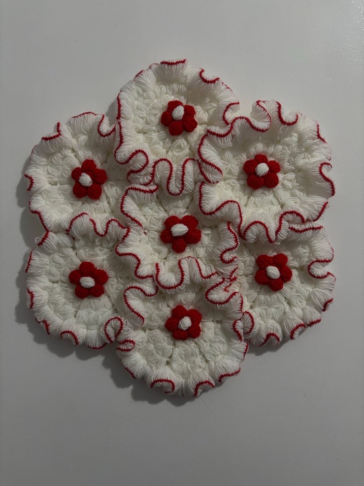 Kırmızı kenar ve merkez detaylı beyaz örgü çiçek motifleri, dekoratif şekilde bir araya getirilmiştir.