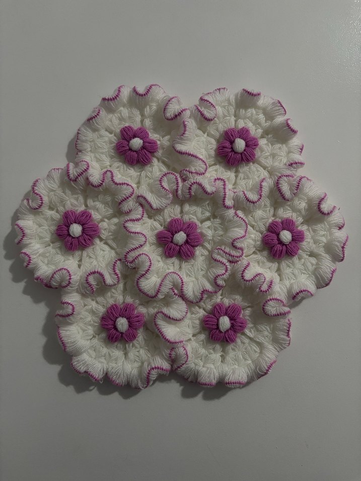 Yumuşak dokulu beyaz banyo süngeri, mor çiçek desenleriyle renkli ve nazik temizleme sağlar.