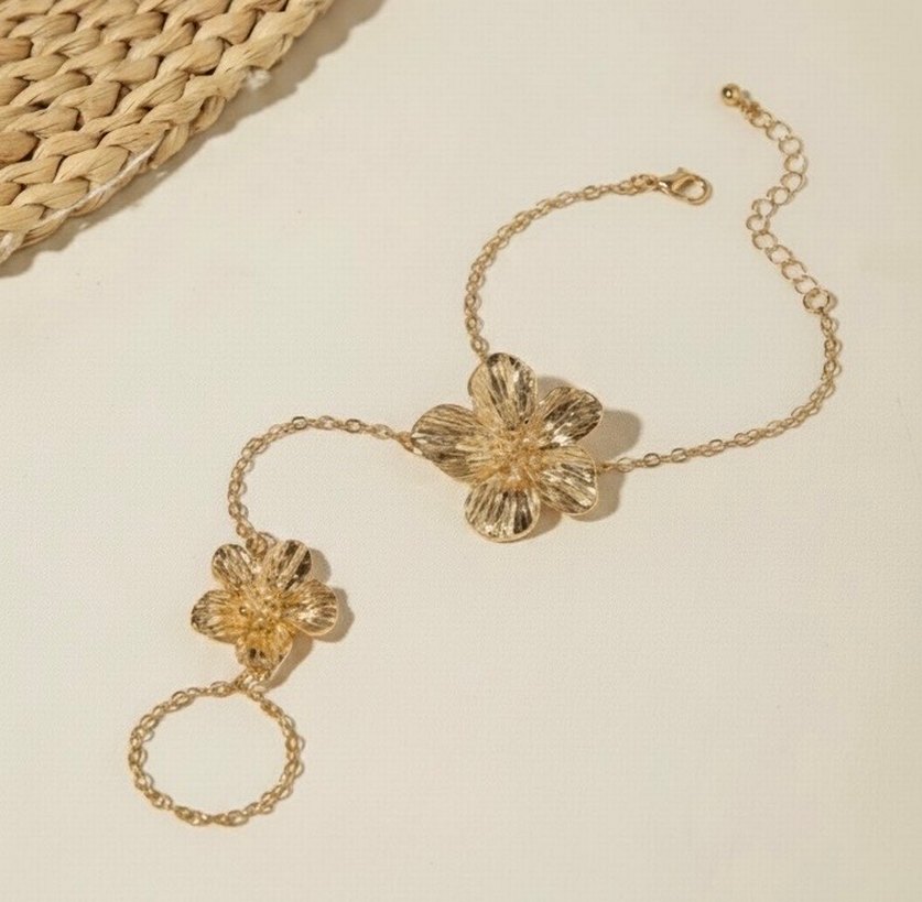 Çiçek desenli, detaylı altın renkli el zinciri, bohem tarzı ve düğünler için uygundur.