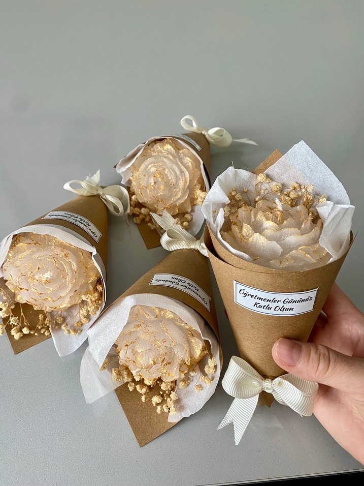 Çiçek şeklinde tasarlanmış mum buketi kahverengi kağıt ve kurdele ile sarılmış, hediye için uygun. Öğretmenler günü hediyesi
