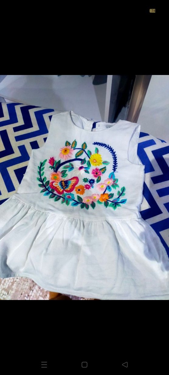 Renkli çiçek işlemeli, kolsuz beyaz kız çocuk elbisesi, bol kesim ve fırfır detaylı, bohem tarzda.