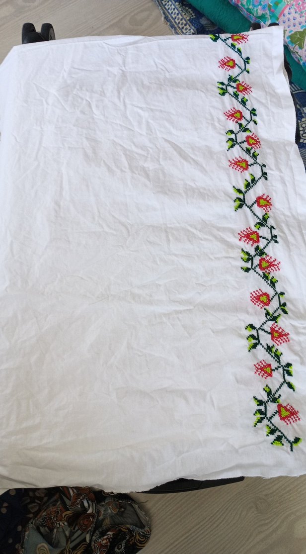Kırmızı ve yeşil renklerde çiçek işlemeli, geleneksel el işçiliğiyle beyaz kumaş.