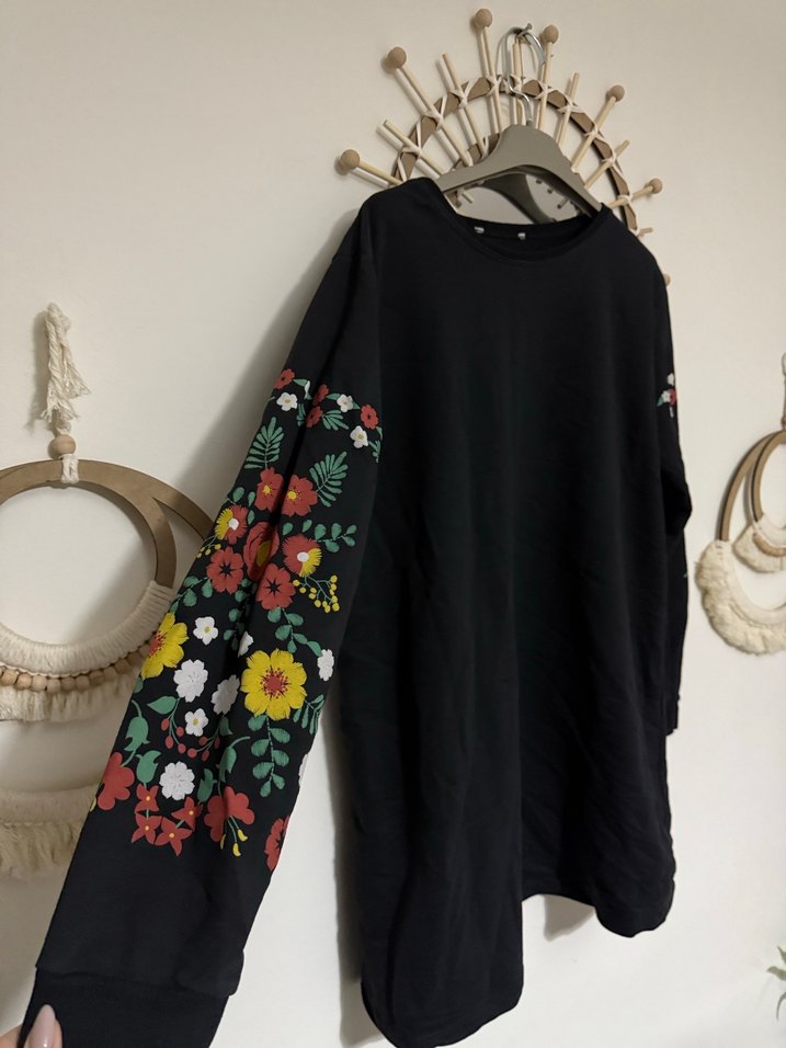 Renkli çiçek işlemeli uzun kollu, bol kesim elbise . Yuvarlak yaka ve dökümlü uzun boyuyla bohem tarzı yansıtıyor.
