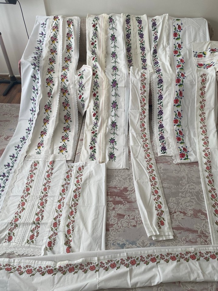 Beyaz zemin üzerine çeşitli renklerde çiçek işlemeleriyle süslenmiş geleneksel el işi kumaş seti. Hepsi erişilmesi 16 parça kaneviçe set