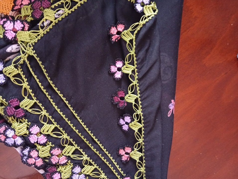 Çiçek işlemeli ve zincir detaylı, yumuşak kumaştan kadın fular. Canlı renkleriyle bohem tarzını yansıtıyor.