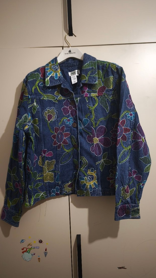 Renkli çiçek işlemeleriyle süslenmiş, düğmeli, uzun kollu koyu denim ceket. Bol kesim ve yaka detaylı, bohem tarzda bir parça.