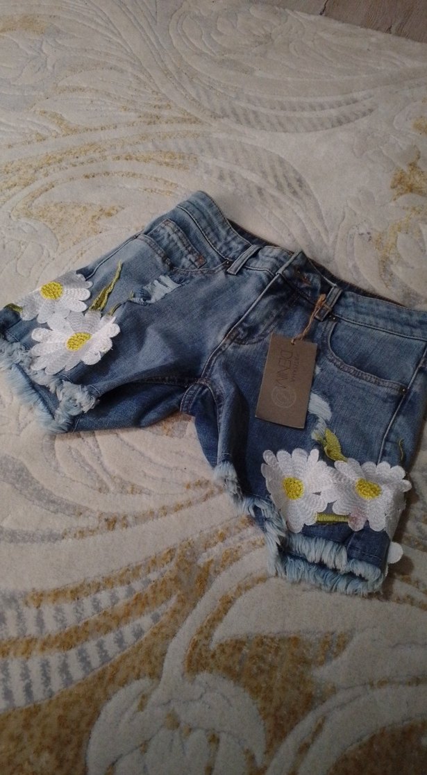 Gevşek kesim, çiçek dantel işlemeli kot şort, kısa boy ve günlük kullanım için uygun rahat sokak stili.