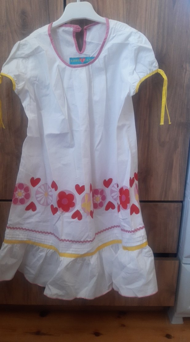 Renkli çiçek işlemeli, bol kesim kız çocuk elbisesi. Yumuşak sentetik kumaş, kısa kollu ve bağcıklı detaylı. Beyaz zemin üzerinde bohem tarzda.arkada düğmesi kopuk tek kusuru bu