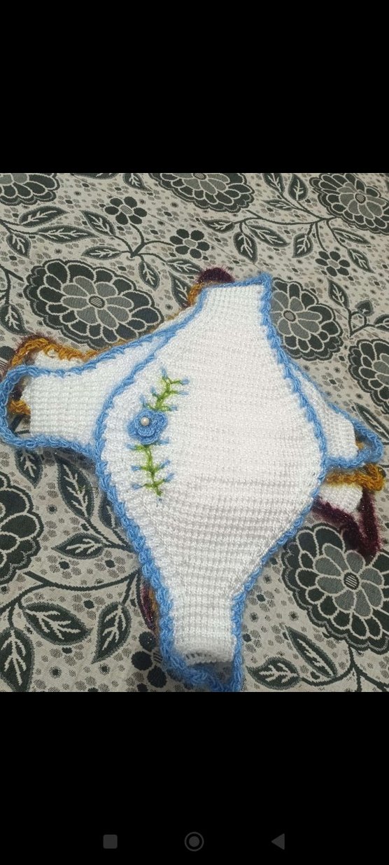 Hafif çok renkli iplikten yapılmış, çiçek işlemeli, mavi kenarlıklı örgü banyo süngeri.