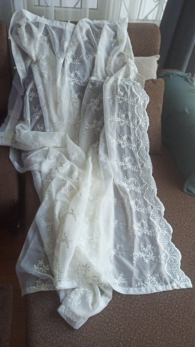 İşlemeli çiçek desenli beyaz bohem tarzda perde, zarif dalgalı kenarlarla. Hafif ve yumuşak kumaş şıklık katıyor. eni 200, boyu 150 cm.dir.