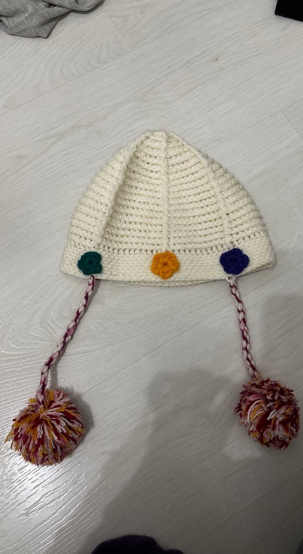 Renkli örgü çocuk beresi, işlemeli çiçek detayları ve ponponlu örgülü iplerle bohem tarz sunar.