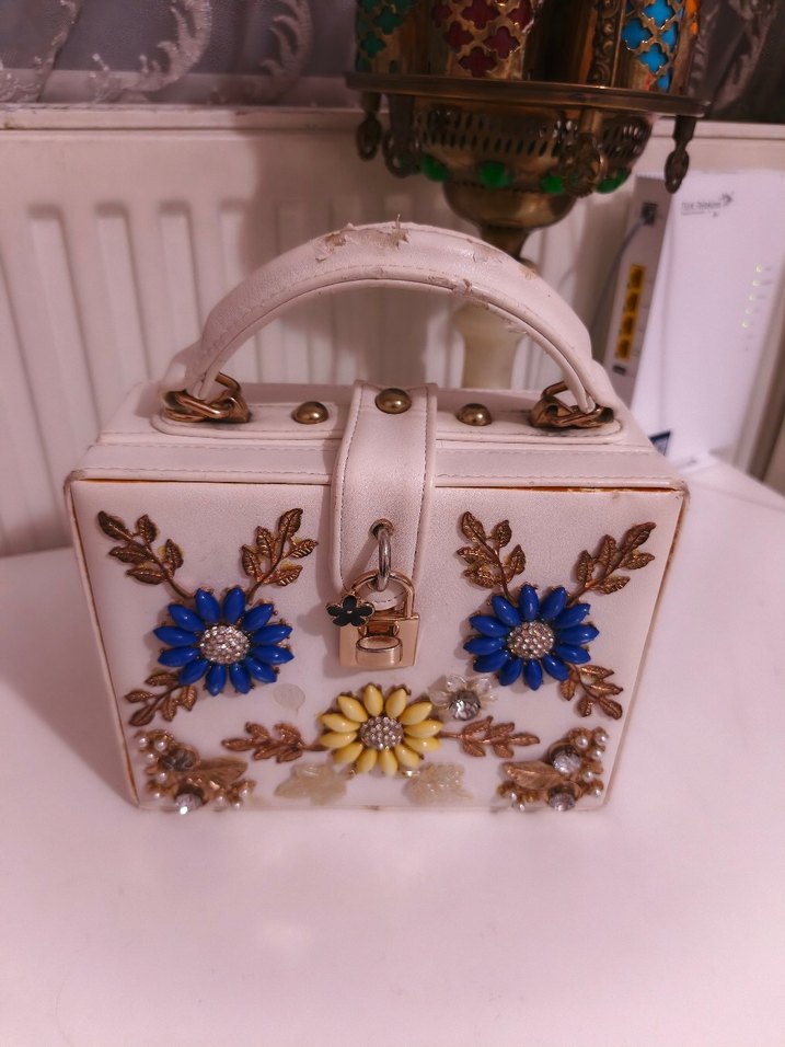 Çiçek işlemeli, boncuk detaylı beyaz seramik vintage kadın çanta. Bohem tarzıyla düğünler için uygundur, üst saplı ve dekoratif kilitlidir.