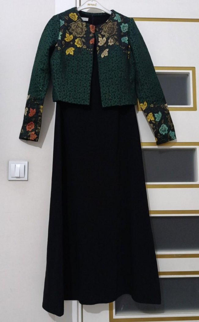 Çiçek işlemeli, koyu renkli, çok renkli tekstil ceketli uzun kadın elbisesi. Notlu yaka ve uzun kollu, ofis için uygun, dökümlü ve bohem tarzda.
